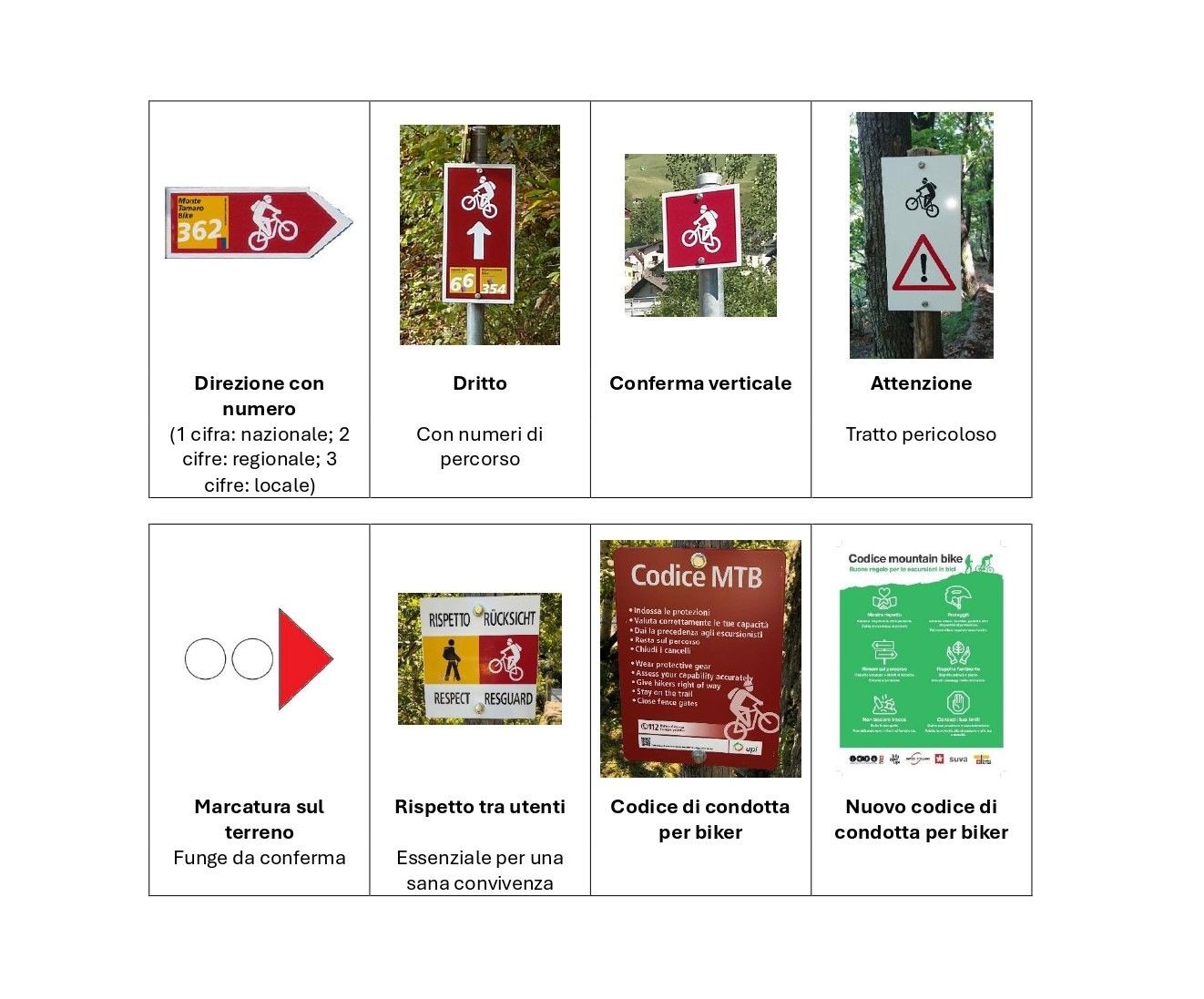 La segnaletica serve per seguire un determinato percorso e presenta alcune particolarità specifiche per la mountain bike. Ecco alcuni esempi: